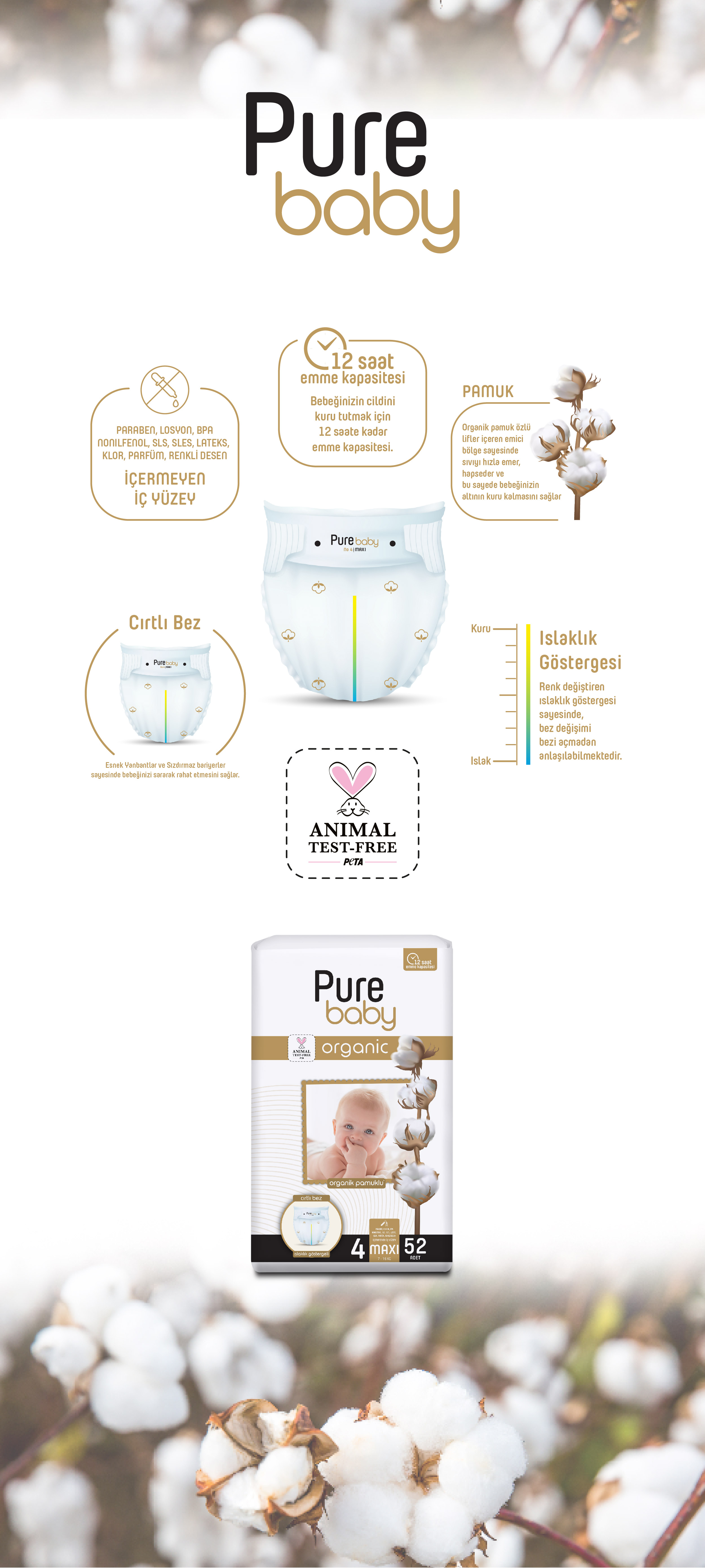 Pure Baby Organik Pamuklu Cırtlı Bez 2'Li Paket 4 Numara Maxi 104 Adet